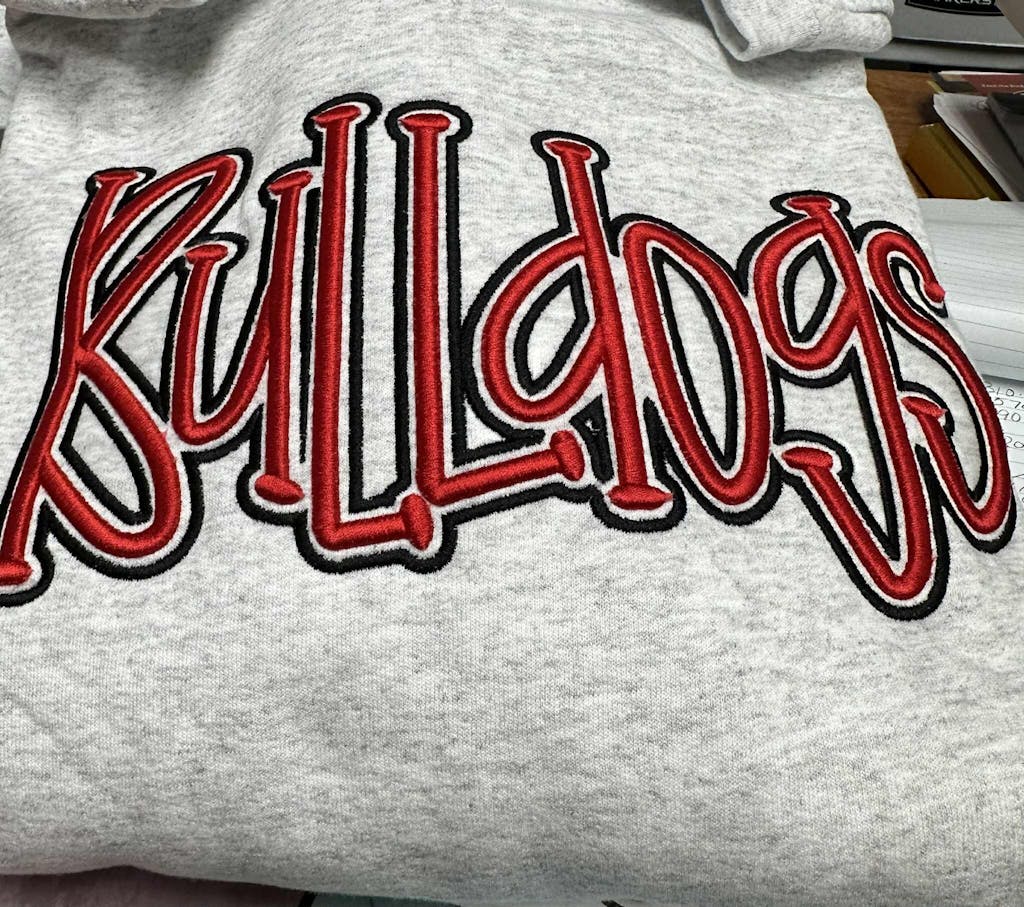 ** Design is digitized with flat embroidery and puff embroidery elements